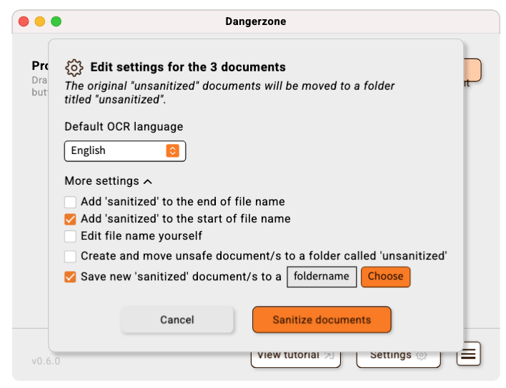 Each of these processes begin, on opening, with a clear message onboarding users and clarifying what Dangerzone does and how it works. This then moves into a recommended settings screen (that is skippable or findable at a later date) and then into View mode or process mode.